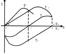 正常運(yùn)轉(zhuǎn)的伺服電動機(jī),只要失去控制電壓,電機(jī)立即停止運(yùn)轉(zhuǎn)。當(dāng)伺服電動機(jī)失去控制電壓后,它處于單相運(yùn)行狀態(tài),由于轉(zhuǎn)子電阻大,定子中兩個相反方向旋轉(zhuǎn)的旋轉(zhuǎn)磁場與轉(zhuǎn)子作用所產(chǎn)生的兩個轉(zhuǎn)矩特性(T1-S1、T2-S2曲線)以及合成轉(zhuǎn)矩特性(T-S曲線)