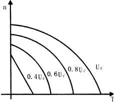 圖5是伺服電動機(jī)單相運(yùn)行時的機(jī)械特性曲線。負(fù)載一定時,控制電壓Uc愈高,轉(zhuǎn)速也愈高,在控制電壓一定時,負(fù)載增加,轉(zhuǎn)速下降。
