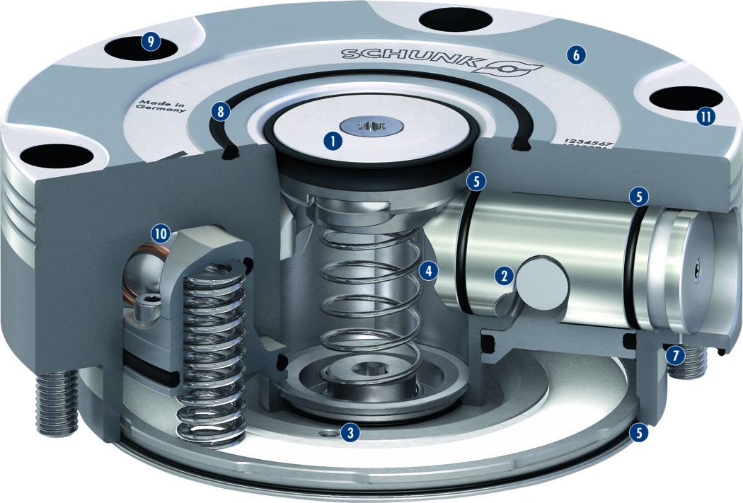 夾持過程由集成的彈簧組件執行。動力傳遞通過專利驅動機構實現,它將有效的彈簧力轉換為定位銷的最大下拉力。夾持自動鎖定,下拉力可在集成渦輪增壓功能的幫助下增加。可使用6 bar系統壓力打開。