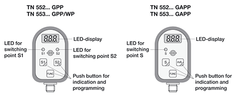緊湊型號TN 552 GPP和TN 552/1 GPP有兩個獨立的可調節開關點。緊湊型號TN 552 GAPP和TN 552/1 GAPP具有一個獨立的可調節開關點和一個可擴展的4 ... 20 mA模擬輸出。